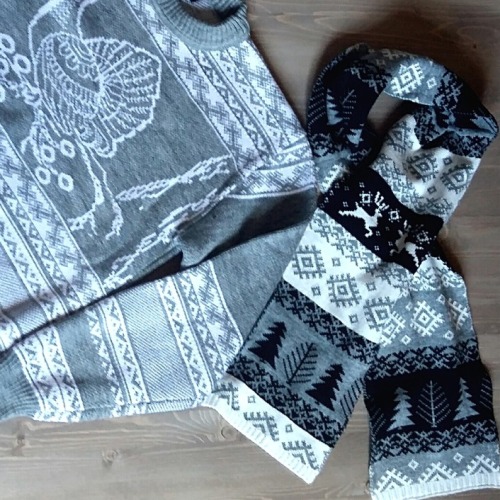 На этом шарфе - олени бегут мимо елочек, и падают снежинки в виде оберегового северного орнамента. авторская разработка Туровой Светланы и Нестерова Сергея.